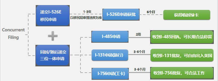 根据政策, 在美国境内的申请人可以在递交I-526E的同时递交I-485身份调整表格。 (对于人在美国境外的EB-5申请人来说,仍然通过领事馆程序最终获得绿卡。)